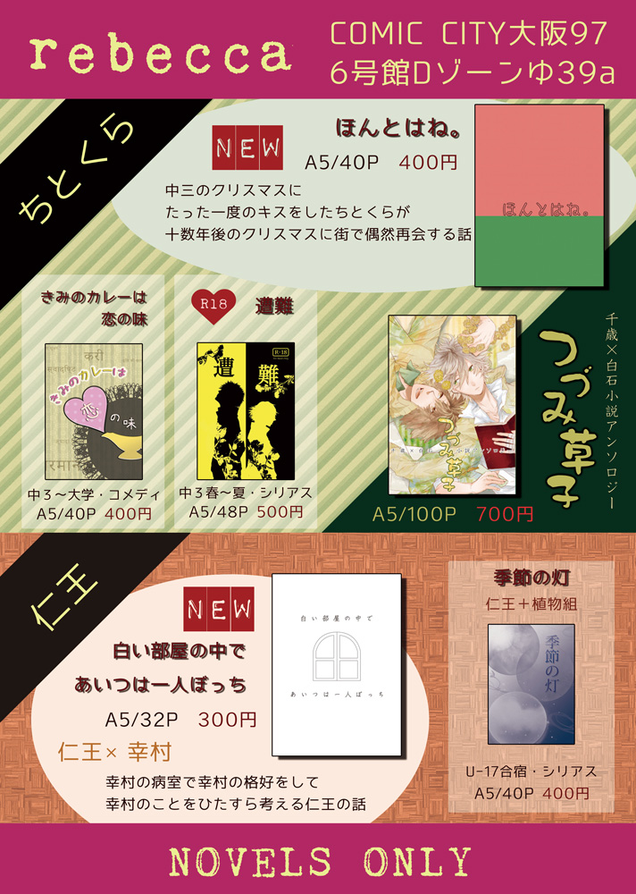 今回1人参加なので(とかって隣はさもこさんですし、一般で来られるひなせさんを引きずり込むつもりなのですが)、ほとんどスペースにいるつもりです。一応は12時くらいからお買い物に出たいな〜と思っていますので、その辺りの時間はいないかもです。すみません。