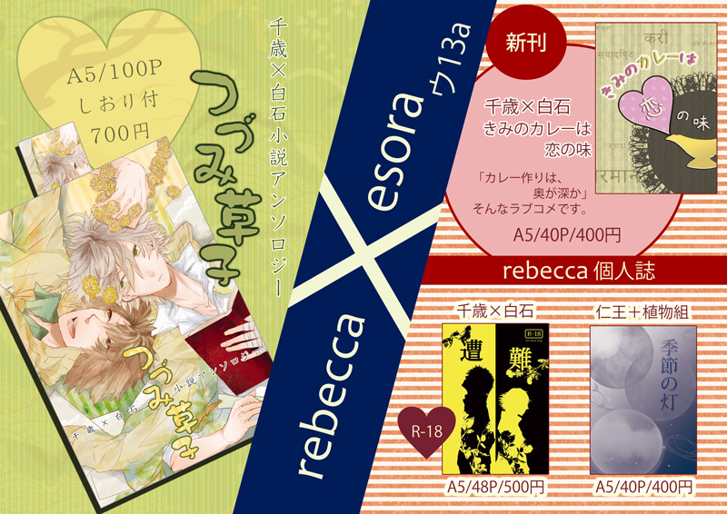 今回はesoraのmiwaさんとの合同で【rebecca×esora】というサークル名で出ます。